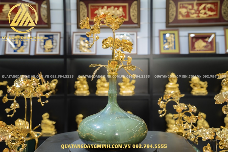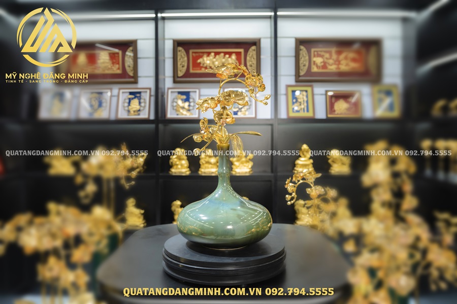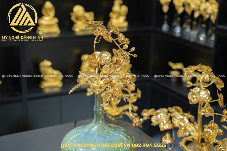 Cỏ cây, hoa lá luôn mang đến cho con người cảm giác thư giãn, là nguồn cảm hứng vô tận cho các nghệ nhân. Quà tặng bằng đồng tạo hình hoa lan vì thế sẽ là món quà tặng vô cùng sang trọng và ý nghĩa. Mời quý vị tham khảo mẫu bình hoa Lan Hút Lộc mạ vàng 24k dưới đây.