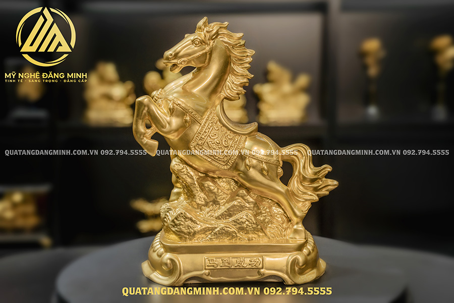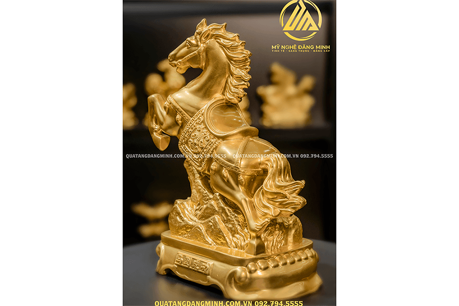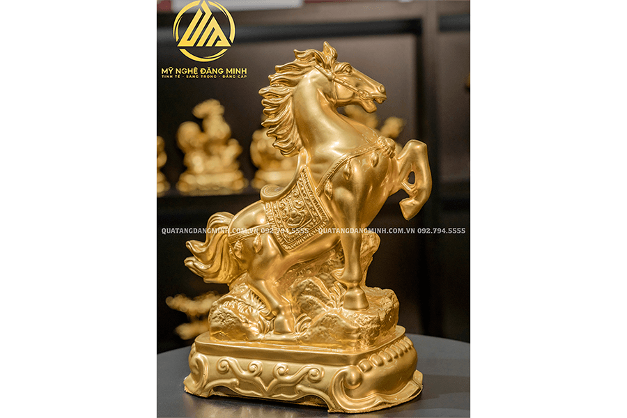 Bức tượng được tạo ra từ đôi bàn tay tài hoa của những người nghệ nhân dày dặn kinh nghiệm nên mỗi đường nét đều được chăm chút cẩn thận, tỉ mí. Từ đó tái hiện chân thực hình ảnh chú ngựa đang phi nước đại với ánh mắt cương trực, cứng cỏi, khỏe khoắn, linh hoạt. Sản phẩm được dát vàng 24k tạo vẻ đẹp cuốn hút, toát lên sự sang trọng, cao quý. Tượng được đặt trên đế gỗ sang trọng và được bảo vệ bởi tấm kính mika. Lại có thêm hộp đựng quà sang trọng, thích hợp làm quà tặng VIP, quà tặng Doanh nghiệp, quà tặng Sếp…