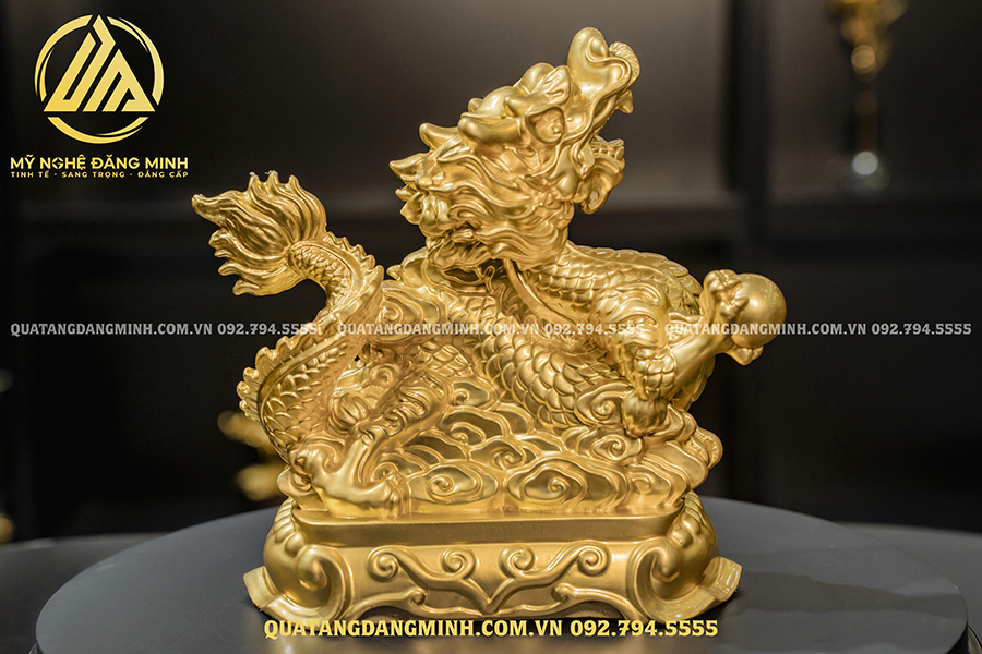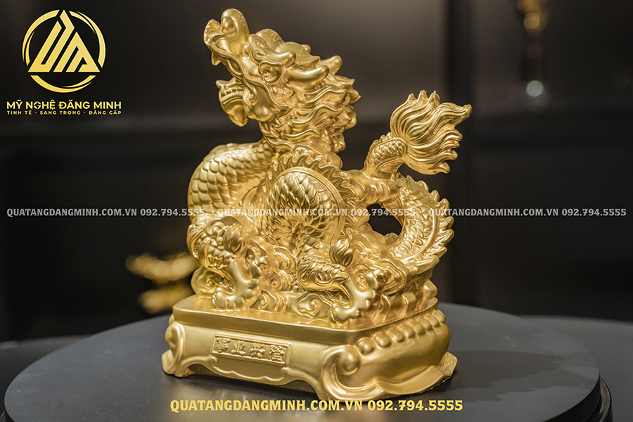 Sản phẩm được chế tác hoàn toàn thủ công từ những người thợ tài hoa của Đăng Minh. Từng đường nét và chi tiết đều được gia công một cách tỉ mỉ và tinh xảo đến bất ngờ. Rồng được tạo hình uống lượn mềm mại nắm ngọc mang đến sự may mắn và của cải của cải cho chủ nhân. Linh vật được dát vàng 24K toát lên vẻ đẹp cao sang, quyền quý, tạo không gian ấn tượng, độc đáo, thu hút ánh nhìn. Màu vàng cũng là màu của quý tộc, mang đến sự giàu sang, thịnh vượng. Đây sẽ là sự lựa chọn tuyệt vời cho những ai đang tìm kiếm vật phẩm trưng bày không gian sống và làm việc. Hoặc là món quà ý nghĩa dành tặng những người quan trọng trong sự kiện đặc biệt nào đó.