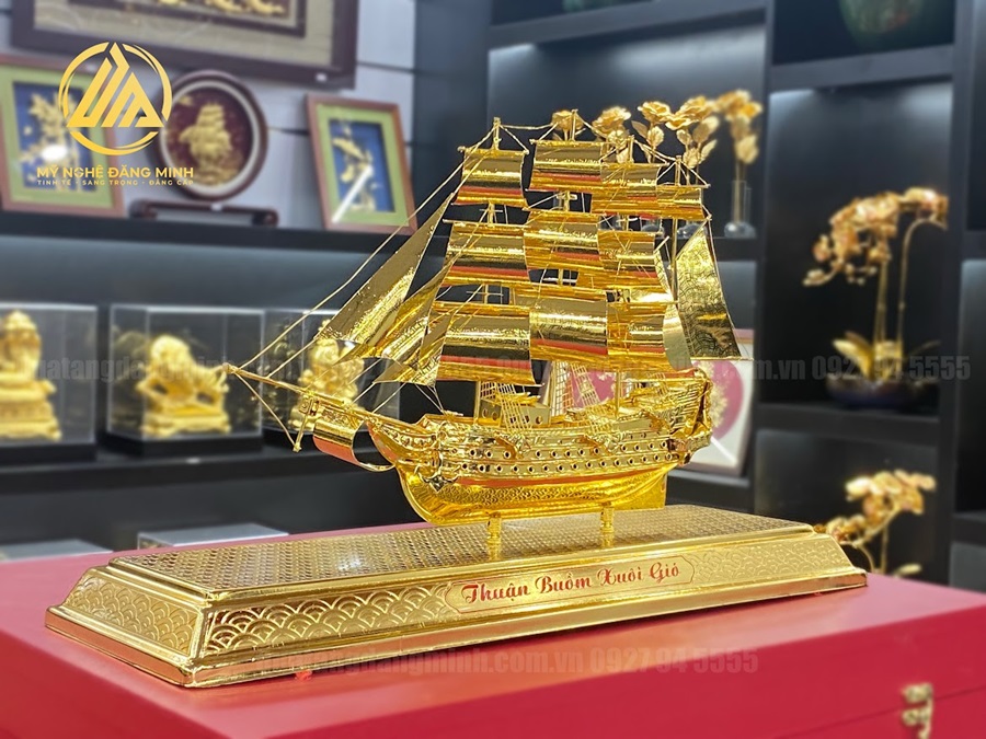 Mô hình thuyền buồm được chế tác từ đồng nguyên chất, bề mặt được mạ vàng 24K tinh xảo, tạo nên vẻ đẹp sang trọng, đẳng cấp. Chân đế vững chắc giúp sản phẩm nổi bật và bền bỉ theo thời gian.
