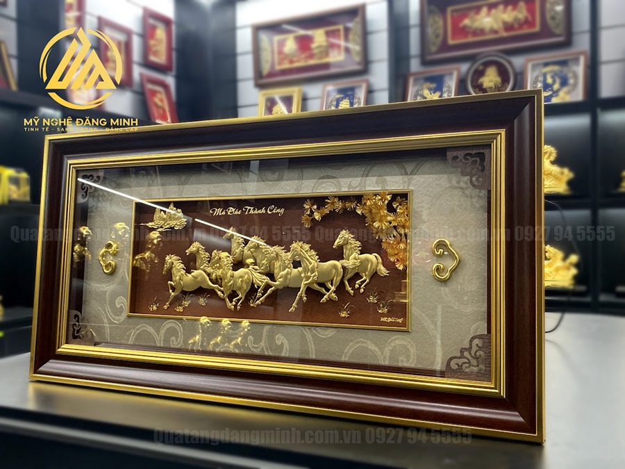 Tranh Bát Mã Truy Phong dát vàng 24K- Mã Đáo Thành Công là một tác phẩm nghệ thuật phong thủy đẳng cấp, mang ý nghĩa sâu sắc về sự thành công, thịnh vượng và bền vững. Đây không chỉ là một món quà tặng cao cấp mà còn là một vật phẩm phong thủy mang lại may mắn cho gia chủ.