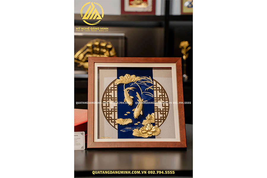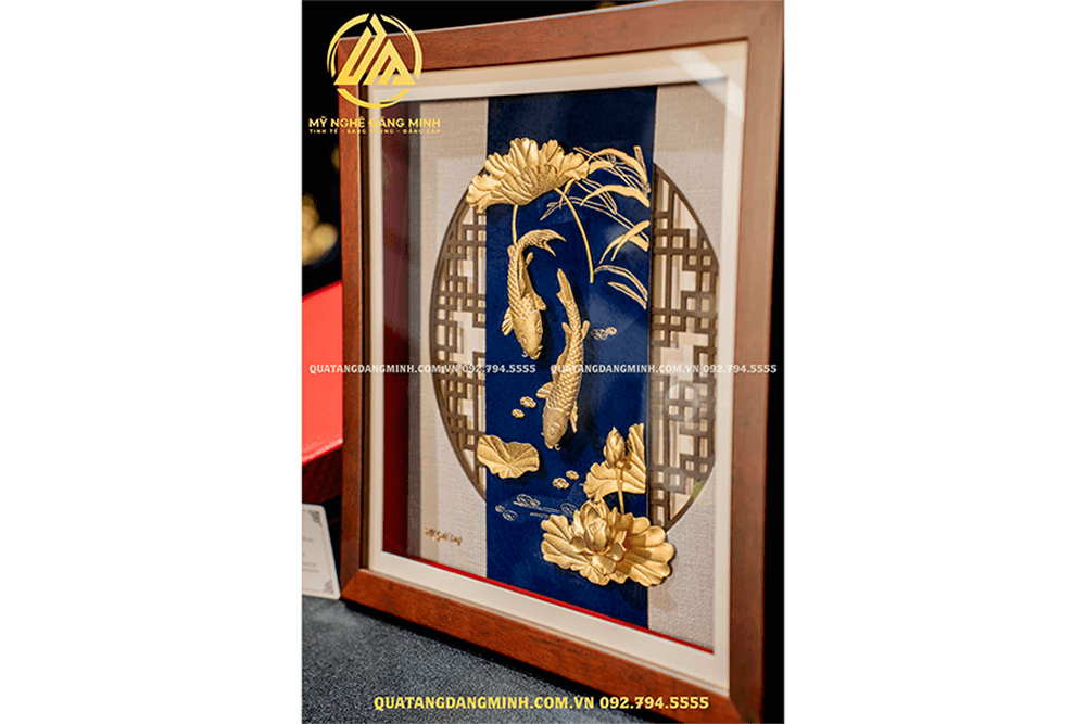 Bức tranh được chế tác thủ công với hình ảnh hai chú cá chép đang bơi lội bên đóa hoa sen đang khoe sắc, tỏa hương. Toàn bộ họa tiết trên bức tranh đều được dát vàng 24k. Cách kết hợp màu sắc tạo hiệu ứng tương phản đối lập làm tôn lên vẻ đẹp tinh tế của bức tranh, tạo ấn tượng mạnh mẽ, cuốn hút mọi ánh nhìn. Đồng thời còn toát lên vẻ đẹp sang trọng, quyền quý cho bức tranh.