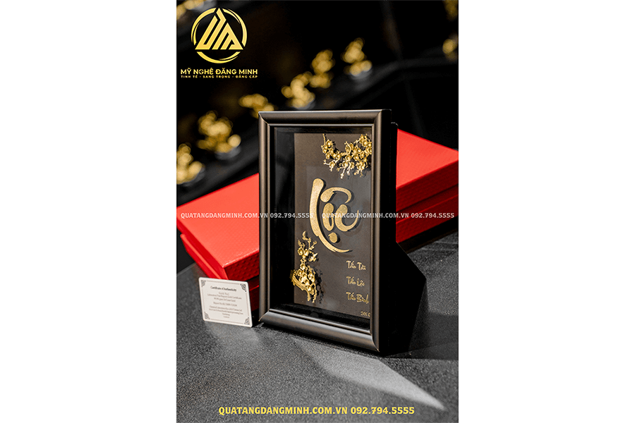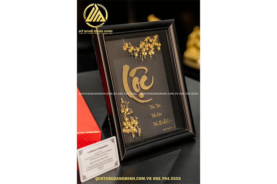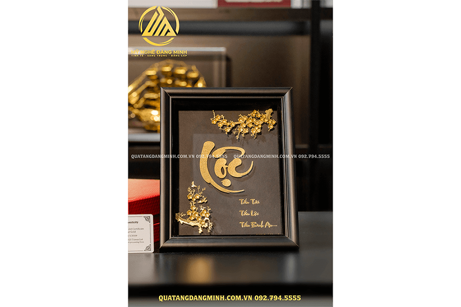 Tranh Phúc – Lộc – Thọ luôn là bộ ba mẫu tranh quà tặng cao cấp. Trong bài viết hôm nay, Đăng Minh xin giới thiệu đến quý khách hàng mẫu Tranh chữ Lộc dát vàng 24K 25x20cm – món quà ý nghĩa do Đăng Minh chế tác, quà tặng đặc biệt trong các sự kiện mừng thọ, tân gia, làm quà biếu tết hay khai trương cửa hàng.