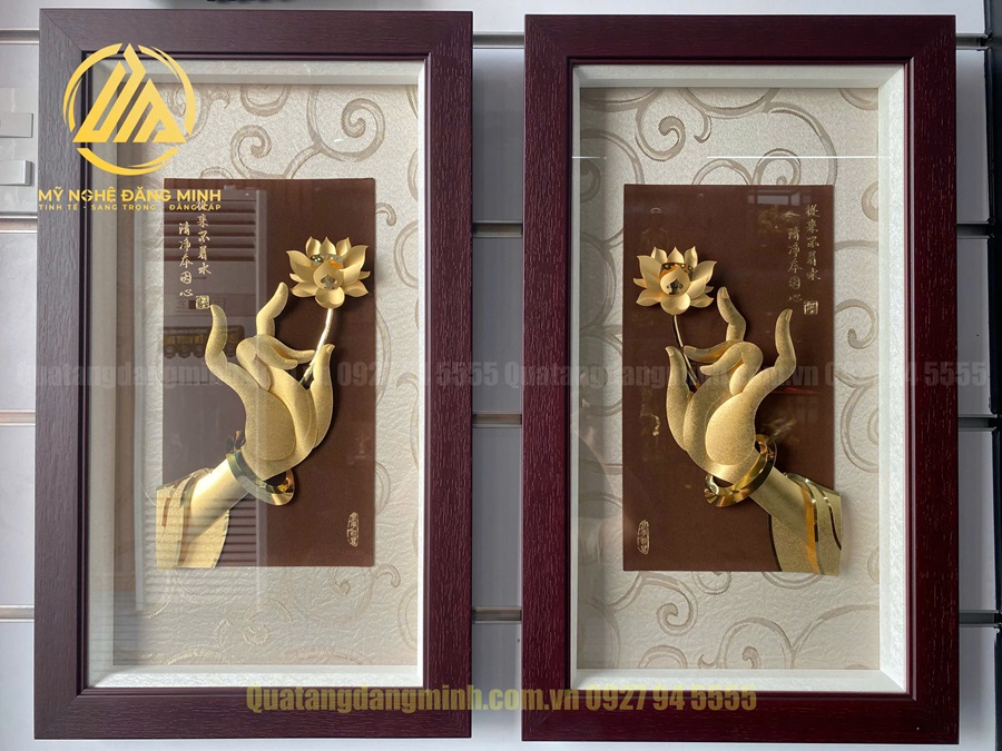 Tranh Phật Thủ Liên Hoa dát vàng 24k là tác phẩm mang giá trị nghệ thuật cao, với sự kết hợp tinh tế giữa hình ảnh bàn tay Phật và hoa sen, tạo nên vẻ đẹp sang trọng và ý nghĩa phong thủy sâu sắc. Bàn tay Phật có thể thực hiện một cách thoải mái chuyển, nâng đỡ hoa sen – biểu tượng của thanh cao và giác ngộ. Nhờ được chế tác từ chất liệu vàng 24k, từng chi tiết trong tranh được làm nổi bật một cách tinh thần, phản chiếu ánh sáng phổi linh, tạo nên sức hút mạnh mẽ và đầy cảm tượng.