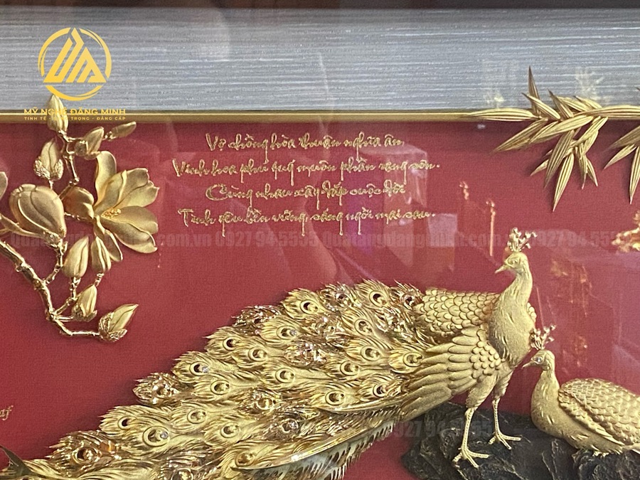 Tranh vợ chồng công dát vàng 24k- tranh Khổng Tước Phu Thê, là biểu tượng của tình yêu thủy chung, sự hòa thuận và thịnh vượng. Đây không chỉ là sản phẩm nghệ thuật cao cấp mà còn mang lại giá trị phong thủy, phù hợp để làm quà tặng trong nhiều dịp quan trọng.