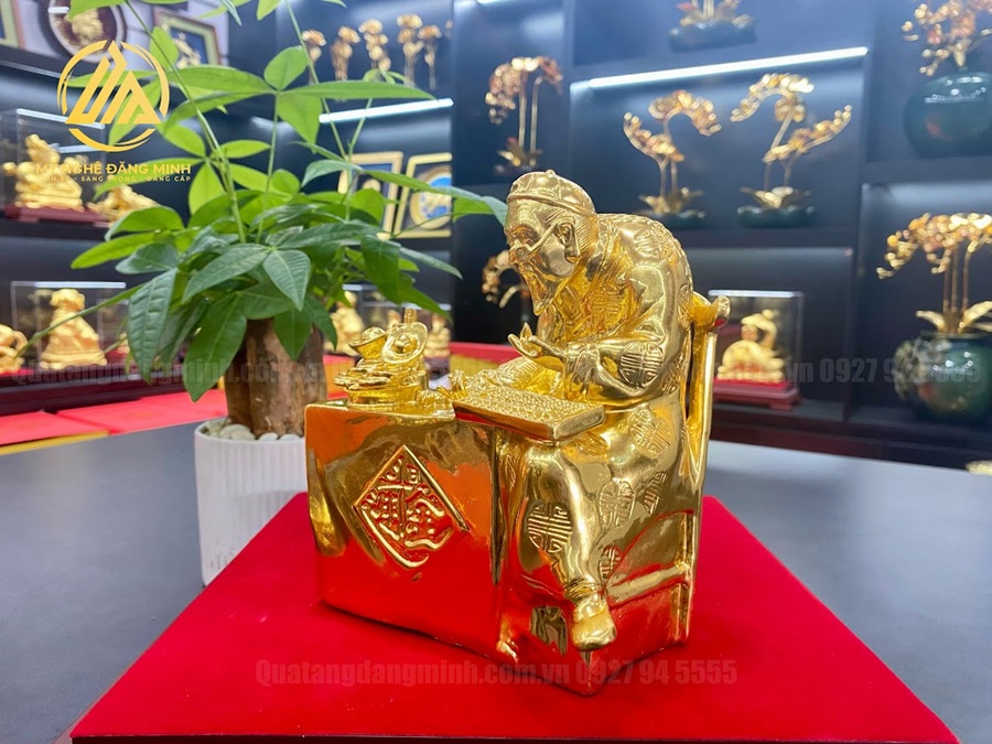 Tượng quản gia ngồi bàn dát vàng 24K là một trong những vật phẩm phong thủy cao cấp được nhiều người yêu thích và lựa chọn. Với hình ảnh người quản gia ngồi bàn nghiêm trang, ánh nhìn sắc sảo, kết hợp chất liệu đồng dát vàng sang trọng, sản phẩm không chỉ thể hiện tính thẩm mỹ mà còn mang nhiều ý nghĩa tâm linh, phong thủy sâu sắc.