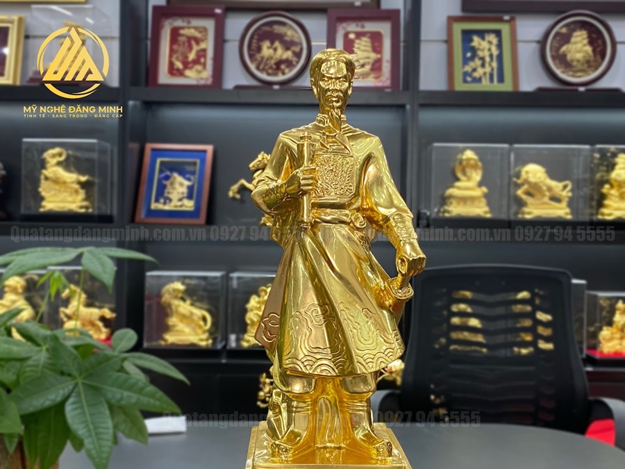Tác phẩm được đúc từ đồng đỏ nguyên chất, sau đó phủ lớp vàng 24K cao cấp, tạo nên vẻ ngoài lấp lánh, đẳng cấp và đầy quyền uy. Từng đường nét khắc họa – từ ánh mắt sắc bén, dáng đứng uy nghi đến tay cầm kiếm chỉ huy – đều được nghệ nhân thực hiện tỉ mỉ, chuẩn xác, khắc họa trọn vẹn thần thái và khí chất của một vị tướng tài ba.
